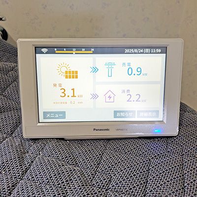 今回は発電実績も確認できるカラーモニターセットで入替のご依頼です。10年以上前に設置した太陽光パネルと言う事で、作業前に電圧計測を行いましたが、初期値に近い数値が出ていてパネル側はまだまだ現役でした!!丁度発電がピークになるお昼頃に工事が終わりましたが、その時のモニターで3.1kWの発電を確認できています。(最大出力4kWのシステム)