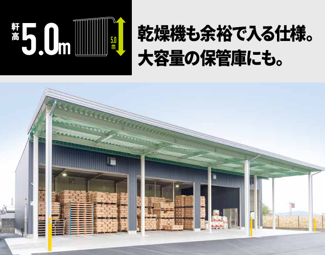 圧倒的な強度を誇る鉄骨構造が、柱の少ない大空間を実現。大型機械や資材を収納できる高さのある広々とした空間を可能にします。
