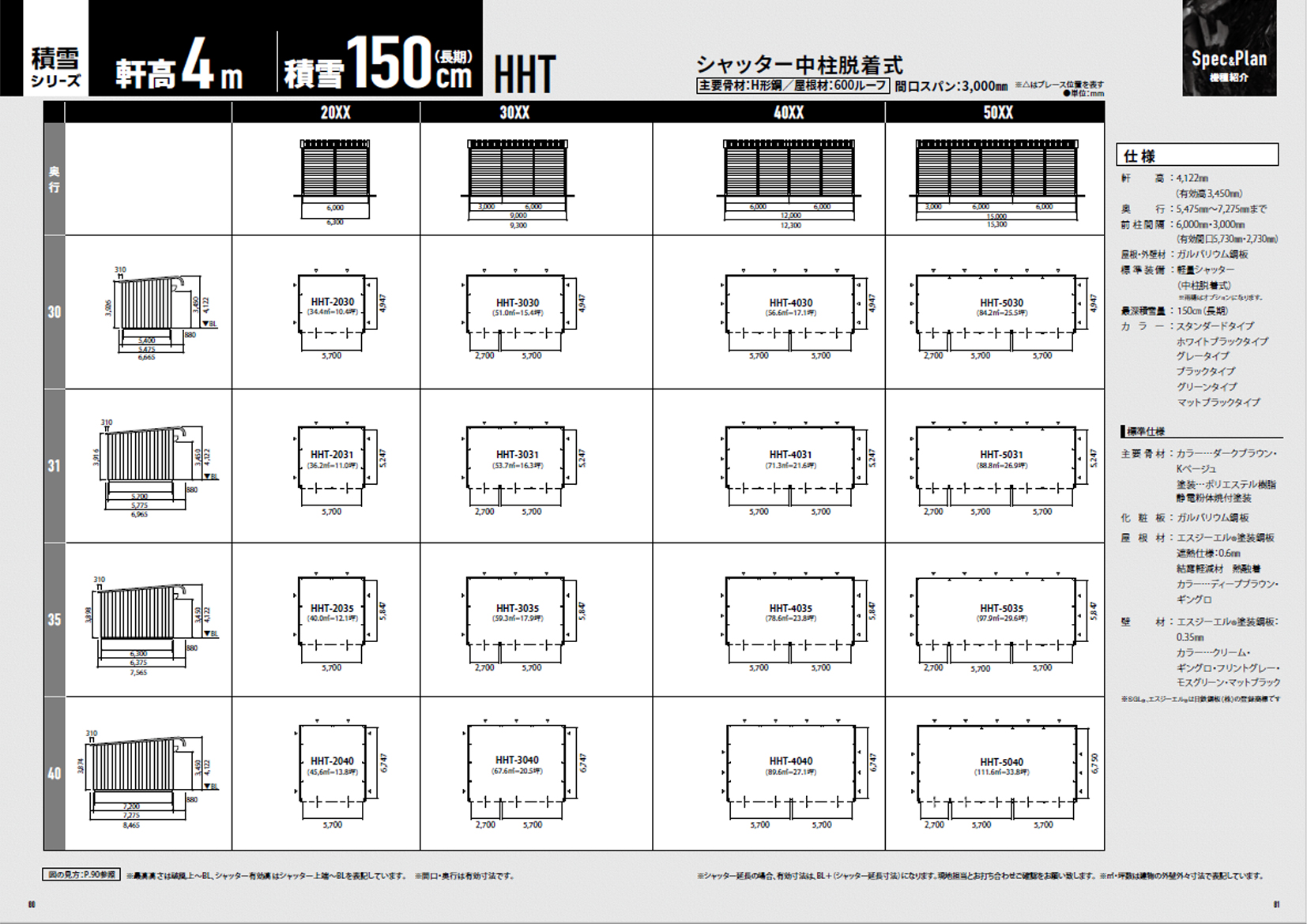 | 軒高 | HHTシリーズ/軒高4,122mm(有効高3,450mm) KKGシリーズ/軒高3,117mm(有効高2,550mm) |