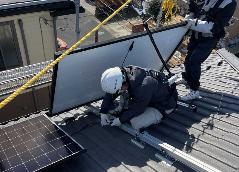 太陽光パネルや蓄電池などを所定の位置に設置。電気配線や通信ケーブルをつなぎ、機器同⼠を接続します。